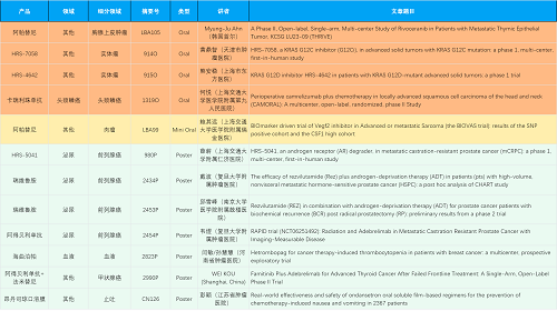 在胸腺上皮肿瘤、头颈鳞癌、肉瘤、前列腺癌、甲状腺癌等其他多个疾病领域,卡瑞利珠单抗、阿帕替尼、瑞维鲁胺、阿得贝利单抗、法米替尼、HRS-7058、HRS-4642、HRS-5041等抗肿瘤创新药相关研究一共入选了4项口头报告、1项简短口头报告、5项壁报,彰显了利来医药强大的研发实力。此外,海曲泊帕和昂丹司琼口溶膜分别在防治化疗导致的血小板减少和恶心呕吐方面各有1项研究入选壁报。